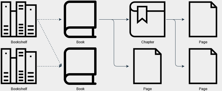 始める前に、BookStack (私たちが使用するウィキ プラットフォーム) がどのように構成されているかを簡単に思い出してください。